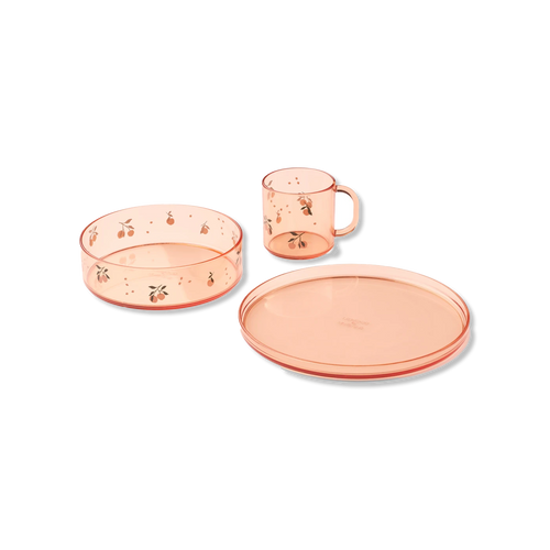 Klart spisesæt i yderst holbart tritan, med rigtig flotte prints på. Spisesættet består af en skål, tallerken og kop. Sættet kan gå i opvaskemaskine i op til 60 grader.
